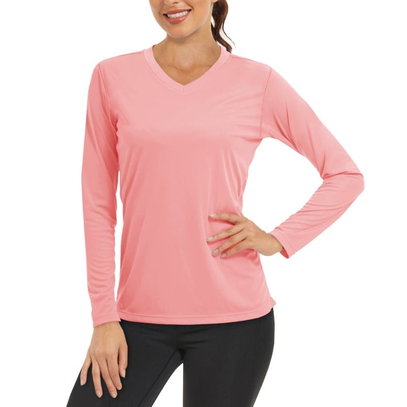 Camiseta de manga larga con cuello en V para mujer, con protección UV50+.Ligero, transpirable, de secado rápido y que absorbe la humedad;Tejido: poliéster.