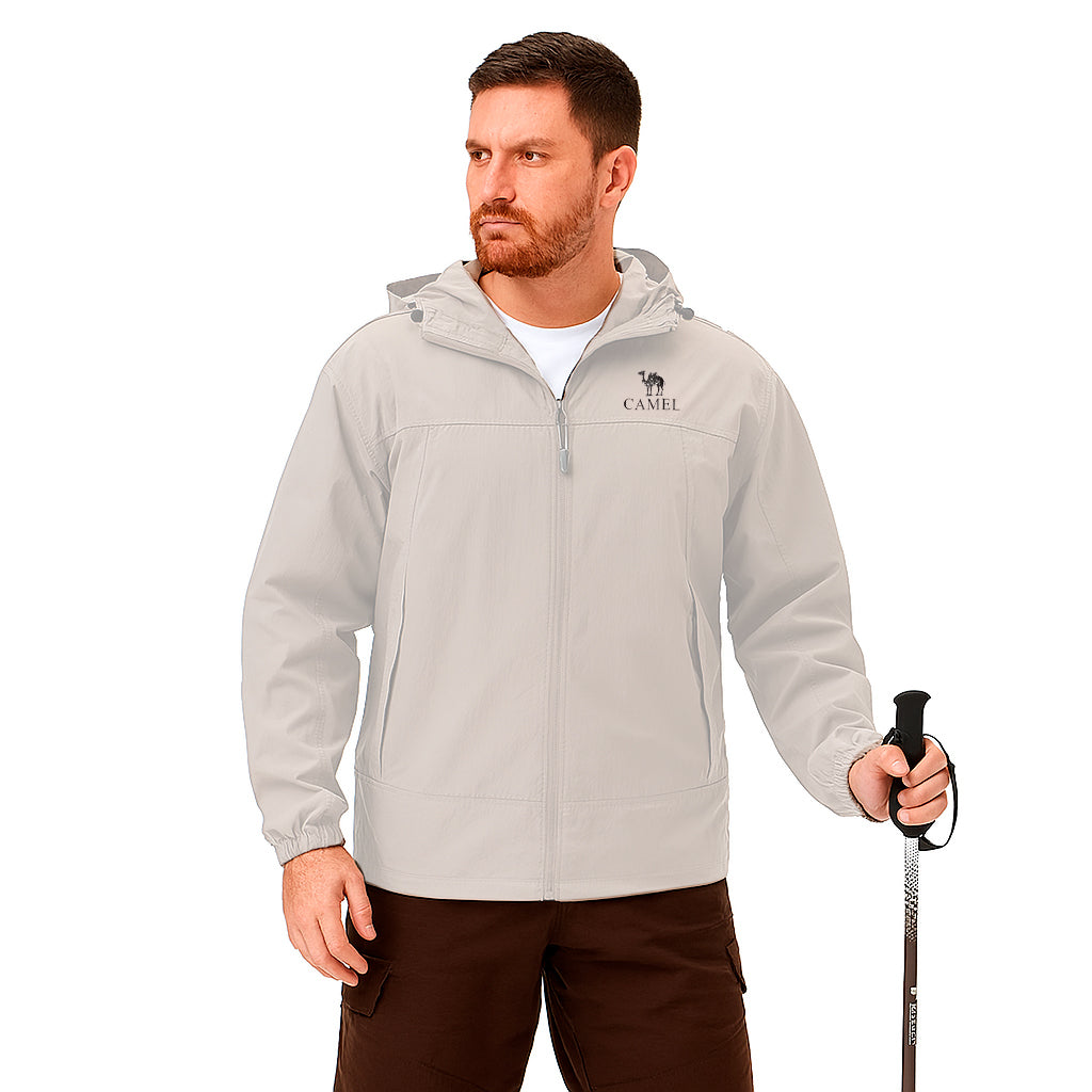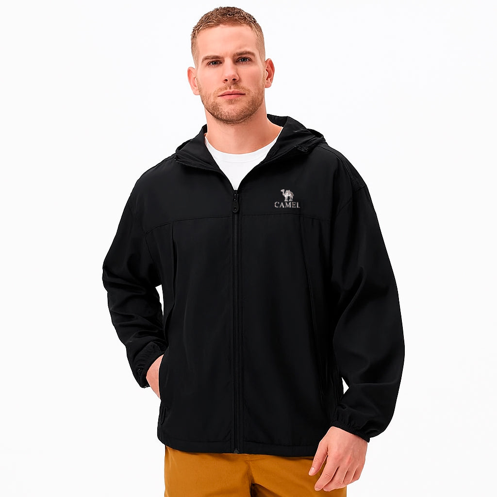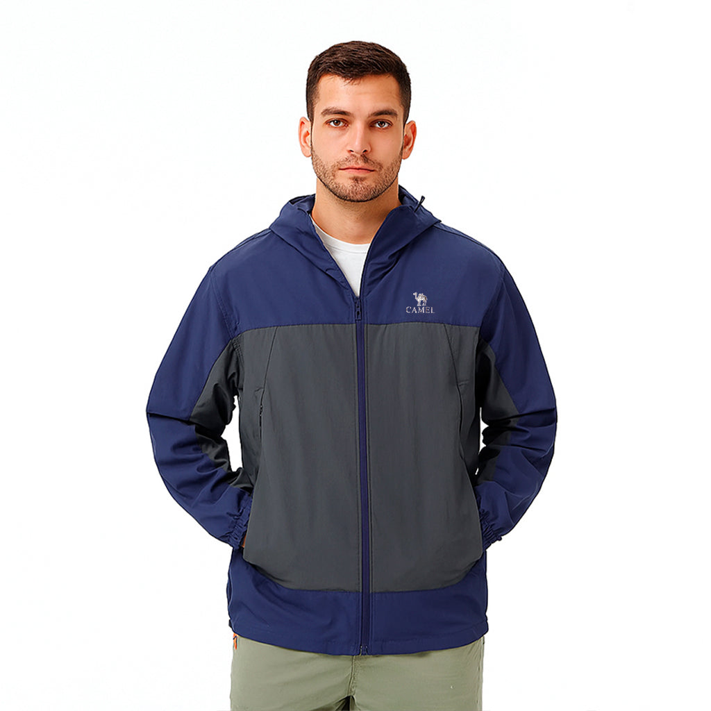 Capucha fija con visera que protege el rostro, cuello alto con tejido perforado para mayor transpirabilidad, bolsillos laterales con cremallera;