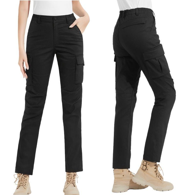 Características: Pantalones cargo de mujer; Diseño moderno y flexible; Recortes que facilitan el movimiento; Cintura elástica; Bolsillos con solapa y velcro; Tejido de algodón, poliéster y elastano.