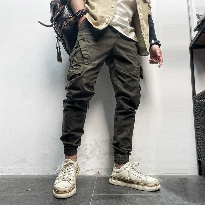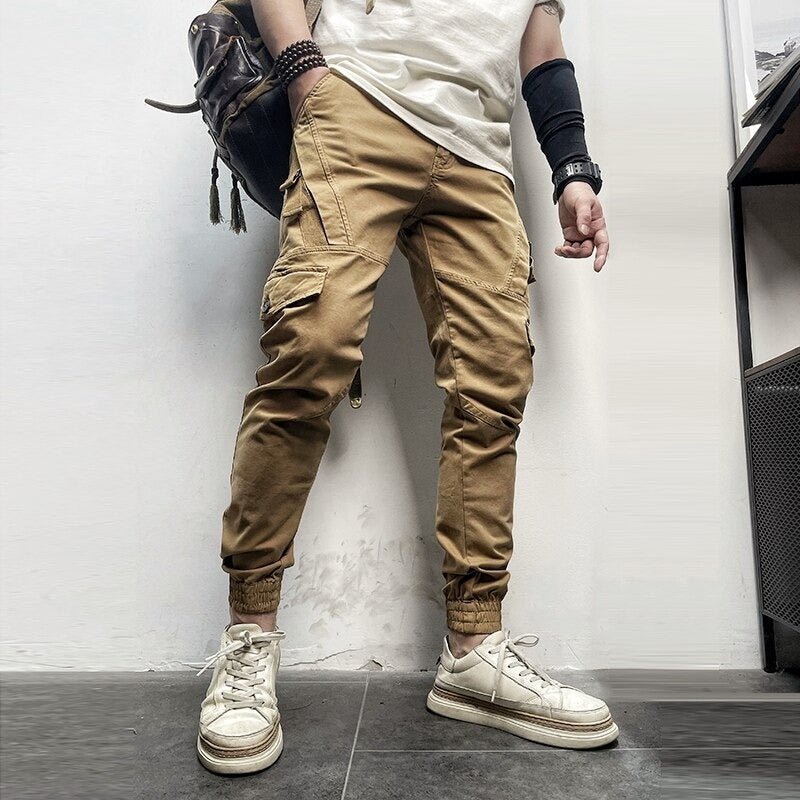 Características: Pantalones cargo para hombre. No tiene elástico en la cintura; Diseño moderno y elegante; Tejido 100% algodón; Correa elástica para el tobillo; Viene con 1 cinturón.