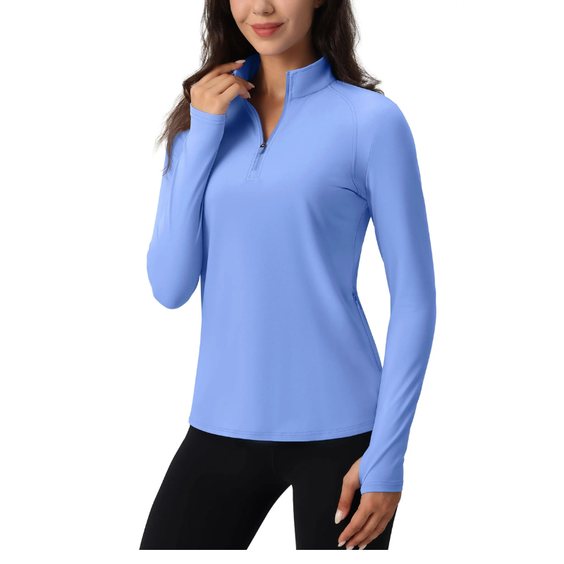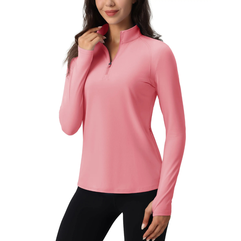 Polera térmica para mujer con mangas elásticas y aberturas para los pulgares, cuello alto para proteger el cuello y bolsillos laterales ocultos con cremallera.