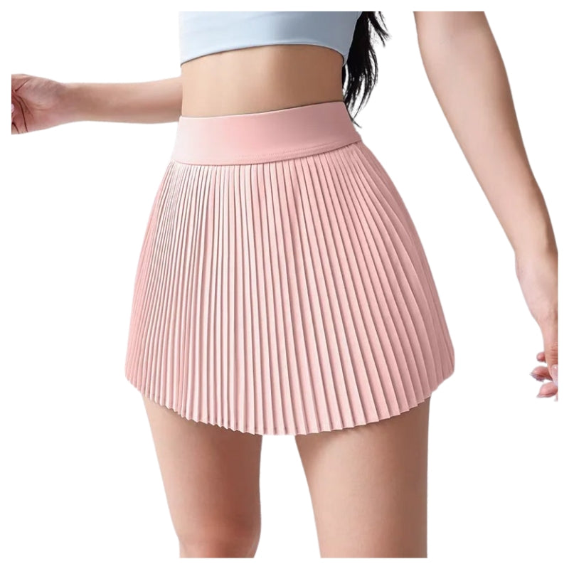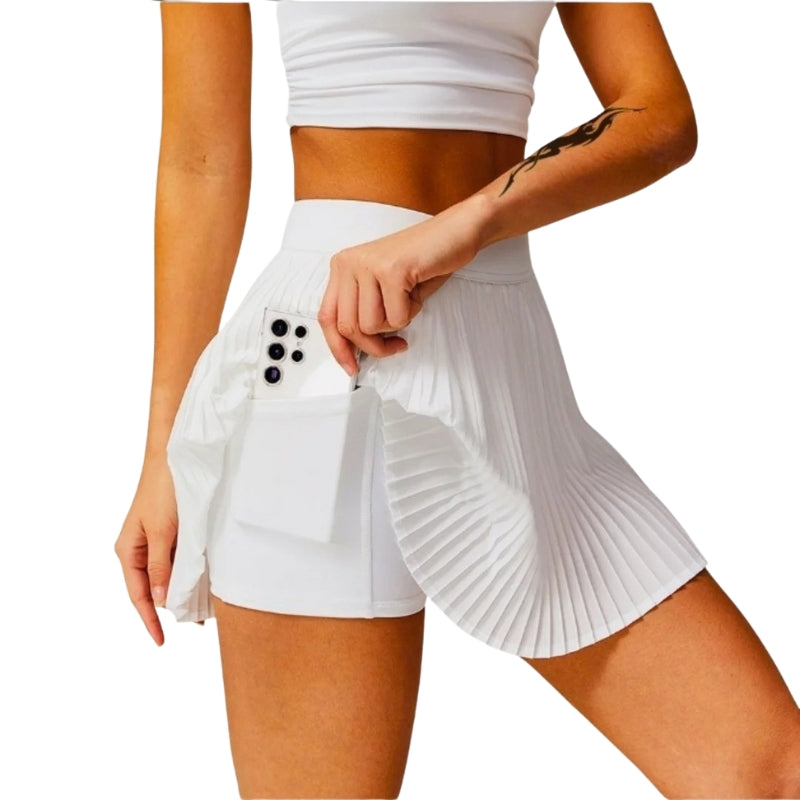 Falda short para mujer con diseño plisado y cintura alta, forro con bolsillo lateral; ideal para yoga, running o actividades informales al aire libre.